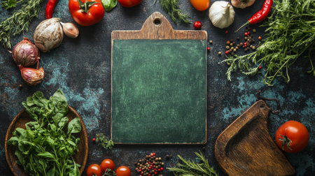 Rustic kitchen setting with vegetables and herbs around a blank chalkboard.