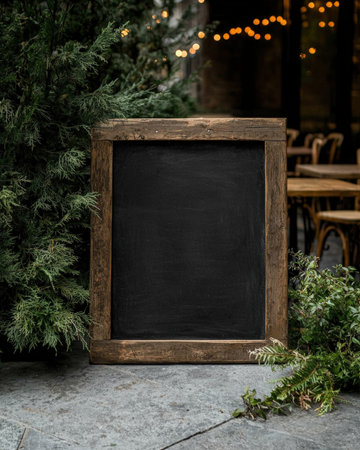 Blank chalkboard sign outside cozy urban cafe with warm lights, inviting atmosphere, and reflections in large glass windows.