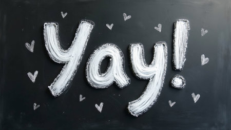 Cheerful Yay in bubbly handwriting with scattered hearts on chalkboard