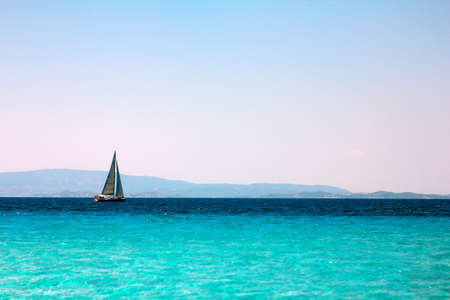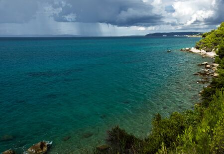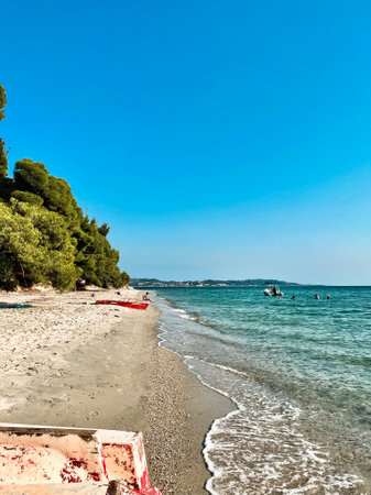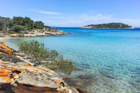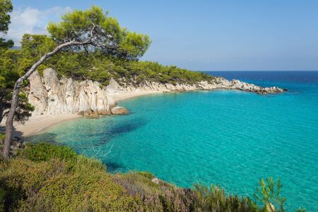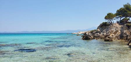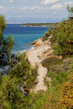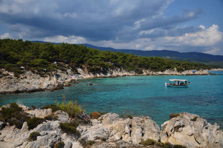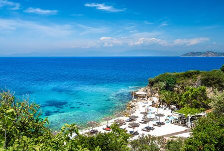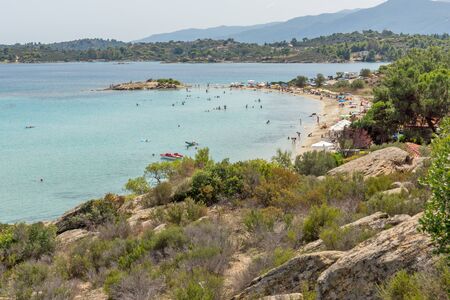 Vourvourou, Greece, July 22, 2016: Aegean sea coast landscape, Karidi beach (Chalkidiki, Greece).