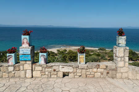 Afytos, Greece, July 9, 2021: Situated on top of a hill, the village of Afitos, or Athitos, features stone houses and cobbled streets.
