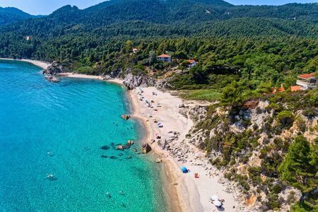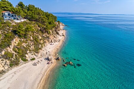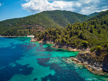 Mediterranean Greek landscape beach drone shot. Aerial top view of Sithonia Chalkidiki peninsula above rocky coastal with green plantation and crystal-clear waters.