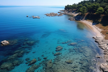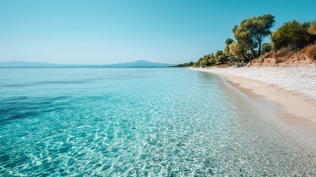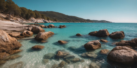 AI Generated. Beautiful coastal landscape with clear turquoise water and rocky shoreline under a bright blue sky