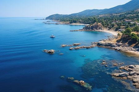 Drone view of boat in calm waters around rocky coast with green plantation in the Mediterranean at Chalkidiki peninsula, Greece