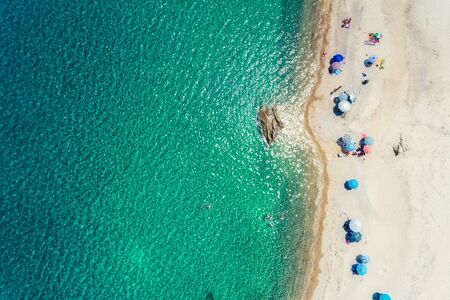 Aerial View of the beach Fava with colorful umbrellas, swimming people in sea in Vourvourou in Chalkidiki, Greece.