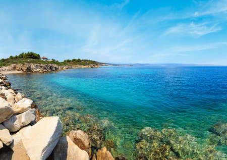 Summer Sithonia coastline and Aegean sea scenery with beach and house (Lagonisi, Halkidiki, Greece). Panorama.