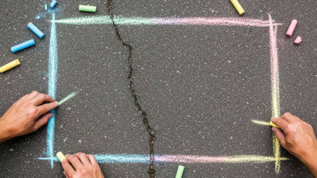 Close-up view of hands using chalk to draw a rectangular frame on a dark, cracked asphalt surface, with scattered chalk sticks nearby