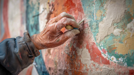 With a steady hand a craftsman is carefully touching up faded paint on a historical mural bringing vibrant colors back to a onceforgotten masterpiece