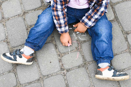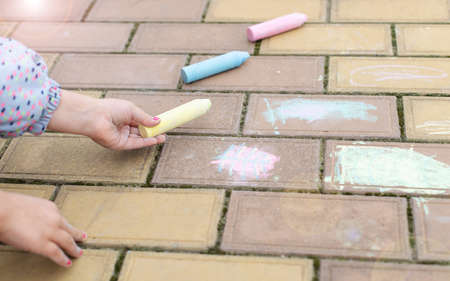 Drawing with chalk on the pavement. The child draws chalk on the road. children's creativity. The girl likes to draw.