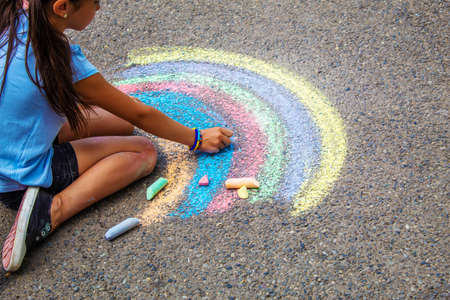 A child draws a rainbow on the asphalt. selective focus. kid.
