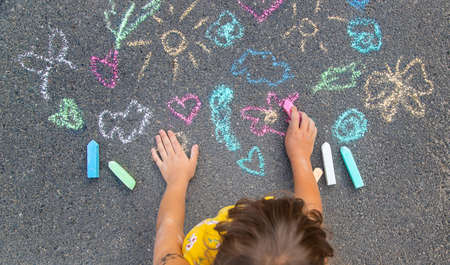 The child draws on the asphalt with chalk. Selective focus. Kid.