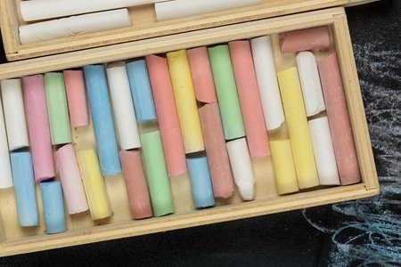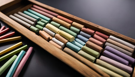 A close-up shot of a wooden box filled with colorful chalk sticks. The vibrant colors of the chalk are arranged neatly in the compartments of the box, creating a visually appealing and artistic composition.