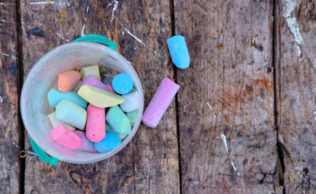 summer photography. colored crayons on a wooden background. bright chalk