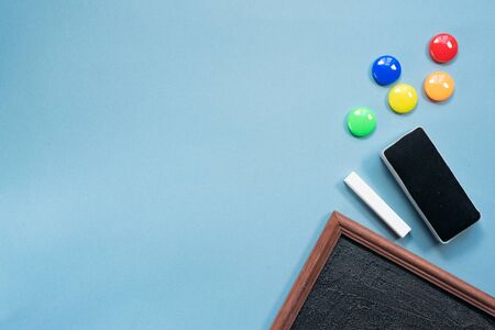 Blackboard frame with copy space, color magnets, chalk with sponge on blue flat lay background. Back to school concept.