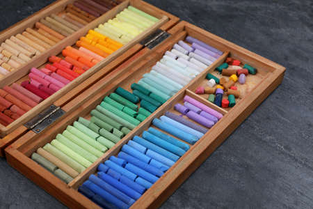 Set of colorful pastels in wooden box on gray stone table, closeup. Drawing materials