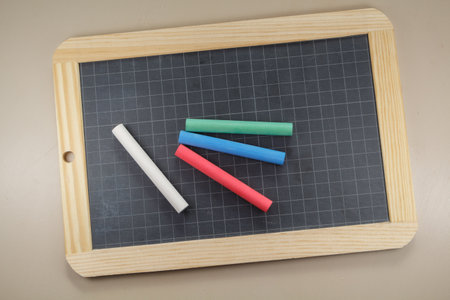 Chalkboard slate with white, red, green and blue chalks