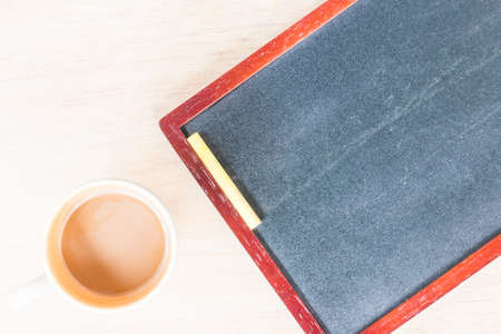 blackboard with chalk and cup of coffee on table
