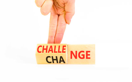 Chance or challenge symbol. Concept words Challenge to Chance on beautiful wooden cubes. Beautiful white background. Businessman's hand. Business challenge or chance concept. Copy space.