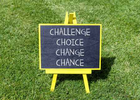 Challenge choice change chance symbol. Concept words Challenge choice change chance on beautiful blackboard. Beautiful grass background. Business Challenge choice change chance concept. Copy space.