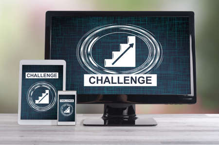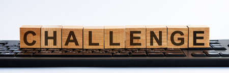 Challenge word made with wooden blocks. Business management concept. Keybord background.