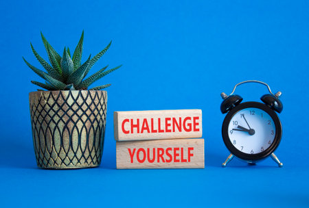 Challenge yourself symbol. Wooden blocks with words Challenge yourself. Beautiful blue background with alarm clock and succulent plant. Business and Challenge yourself concept. Copy space.