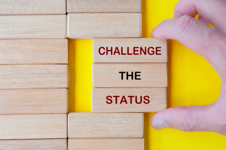Hand pulling out wooden blocks with Challenge the Status text on yellow background