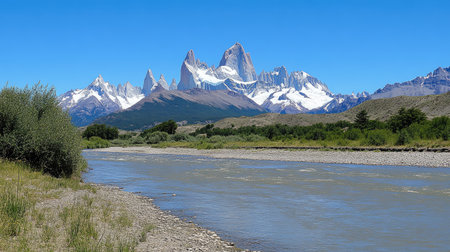 Experience the stunning beauty of towering snow-capped mountains against a brilliant blue sky, showcasing the grandeur of Patagonia's rich alpine landscape and dramatic scenery.