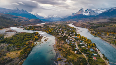This remote village in Patagonia is surrounded by stunning mountains and rivers, showing the beauty of nature and tranquility in a secluded region.
