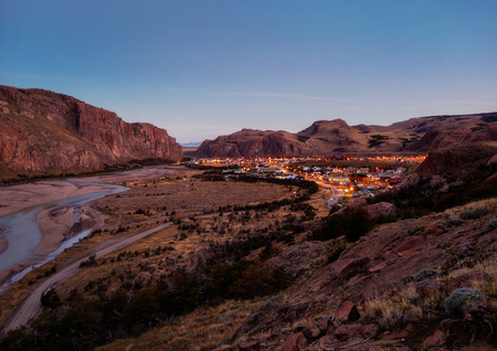 El Chalten at twilight, elevated view, Los Glaciares National Park, Santa Cruz Province, Patagonia, Argentina