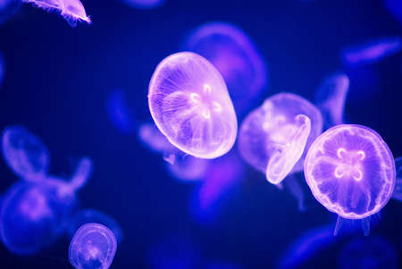 Close-up Jellyfish, Medusa in fish tank with neon light. Jellyfish is free-swimming marine coelenterate with a jellylike bell- or saucer-shaped body that is typically transparent.