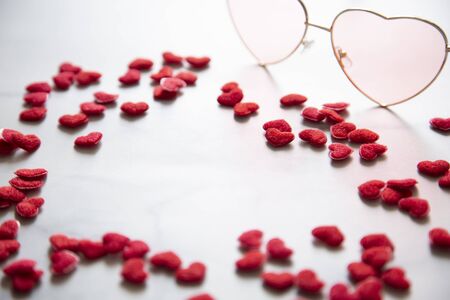 Mini Red Heart and pink glasses on the Mable desk space for text background.