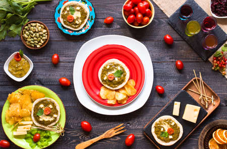 tasty and delicious bruschetta with avocado, tomatoes, cheese, herbs, chips and liquor, on a wooden background. Top view