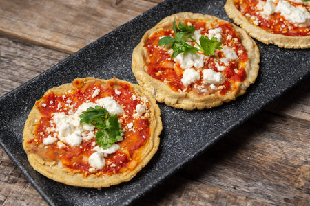 Sopitos, typical mexican dish on wooden table. Sopes, Mexican snack.
