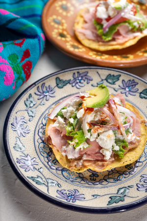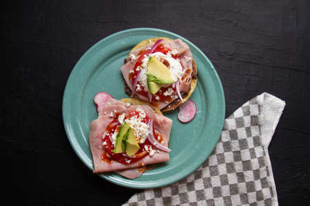 Ham tostadas with cheese and avocado. traditional mexican food
