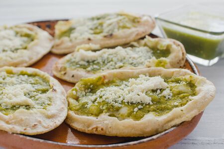 Mexican sopes with grated cheese and green salsa, mexican food spicy in mexico