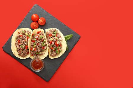 Slate plate with tasty fresh tacos on color background