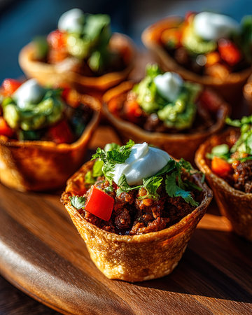 Stuffed taco shells with beef, salsa and guacamole, mexican dish tacos.