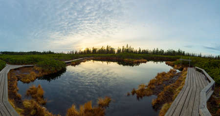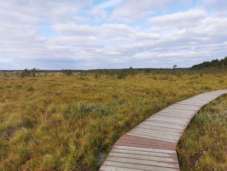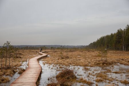 landscape with a pedestrian wooden footbridge over swamp wetlands with small pines. bog plants and ponds, a typical West-Estonian bog. Nigula Nature Reserve