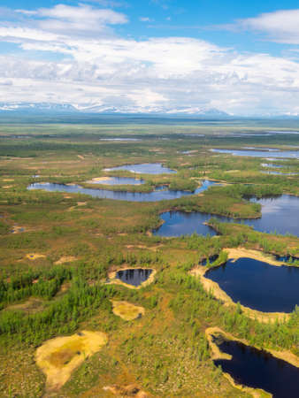 Tundra top view. Beautiful landscape, panorama. Snowy peak, lakes. Polar urals mountains. Yamal