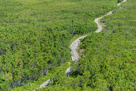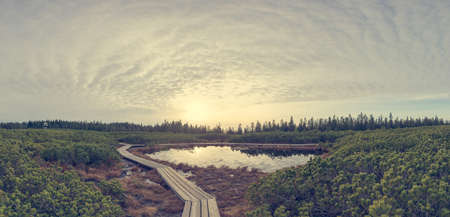 Wooden footbridge leading through mountain peat bog