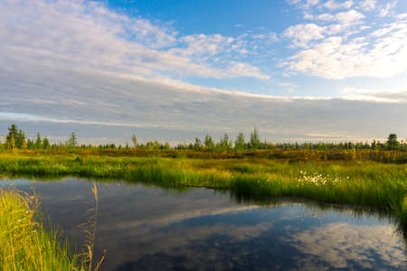 Autumn landscape, extreme north, Yamalo-Nenets Autonomous Okrug. Autumn forest tundra, reflection of a cloudy, blue sky in a pond