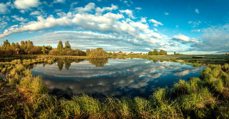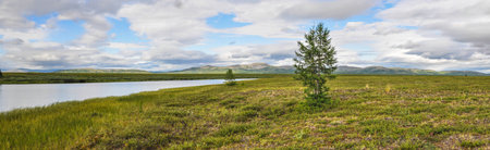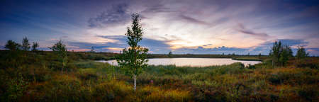 Panorama landscape of sunset on lake, north, siberian, tundra