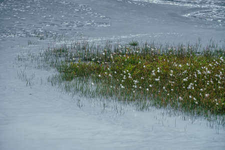 Green grass and many small fluffy flowers grows in silver water stream of mountain river. Nature background with gray mountain creek and green grasses. Natural backdrop with ripples on silver water.