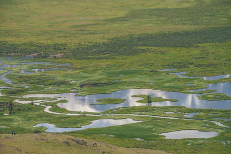 Beautiful green mountain scenery with lake system on tableland. Scenic alpine landscape with lakes group on mountain plateau. Blue lakes system and channels in wide valley. System of mountain lakes.
