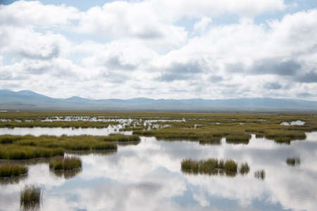 Open grassland and clouds with reflections in water. Iceland.