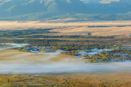 Morning fog over a mountain river valley. River Chuya, Altai Republic, Russia