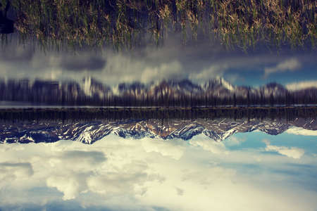 Jagged snowy mountain peaks with snow on the top reflected in shallow river during early summer.