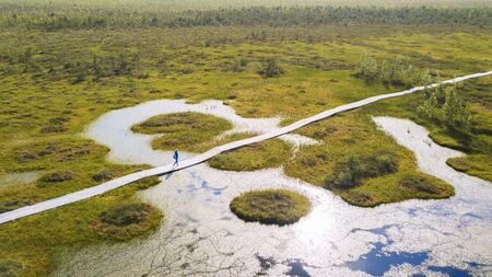 Aerial view of wooden walkway on the territory of Sestroretsk swamp, ecological trail path - route walkways laid in the swamp, reserve Sestroretsk swamp, Kurortny District, Saint-Petersburg, Russia