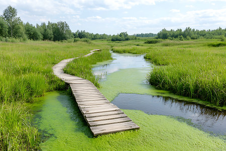A winding wooden boardwalk invites exploration through a vibrant marsh, surrounded by lush greenery and reflecting a bright blue sky with soft clouds.