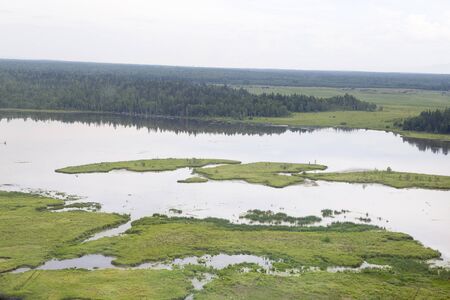 The rivers and lakes of Eastern Siberia from the altitude. A view from the cockpit of the helicopter to the lakes and the river in the Siberian taiga.